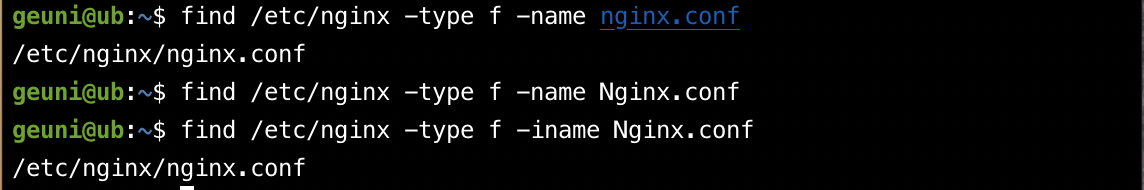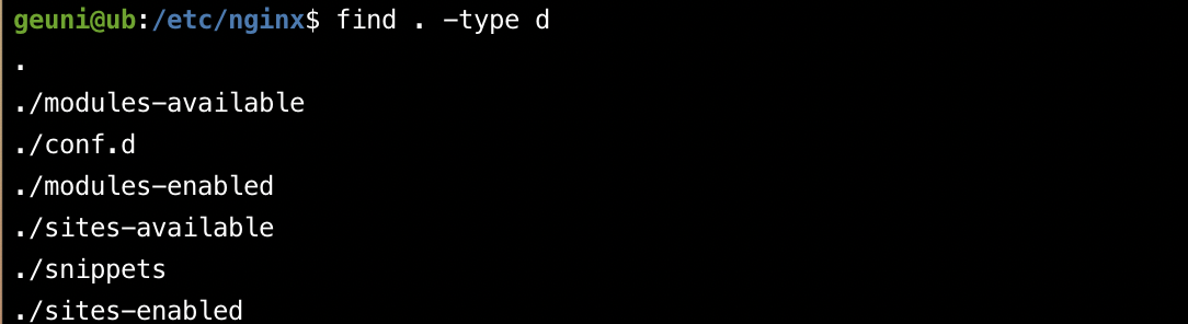 options(-L): 심볼릭 링크를 따라가도록 허용. 기본적으로는 심볼릭 링크가 가리키는 폴더를 검색하지 않음.path...(/etc/nginx): 검색할 디렉토리.expression(-name "*.conf"): .conf로 끝나는 파일 검색.